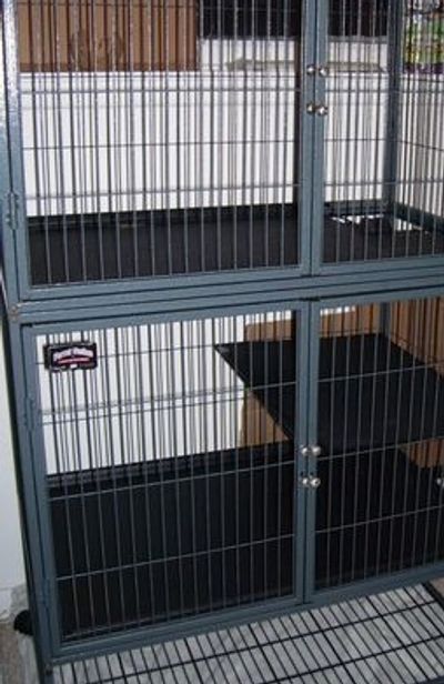 This is my biggest cage and love it except for the small doors. I had a lot of fun designing this cage. It was sold as a cat cage and had wire shelves and ledges which I removed.